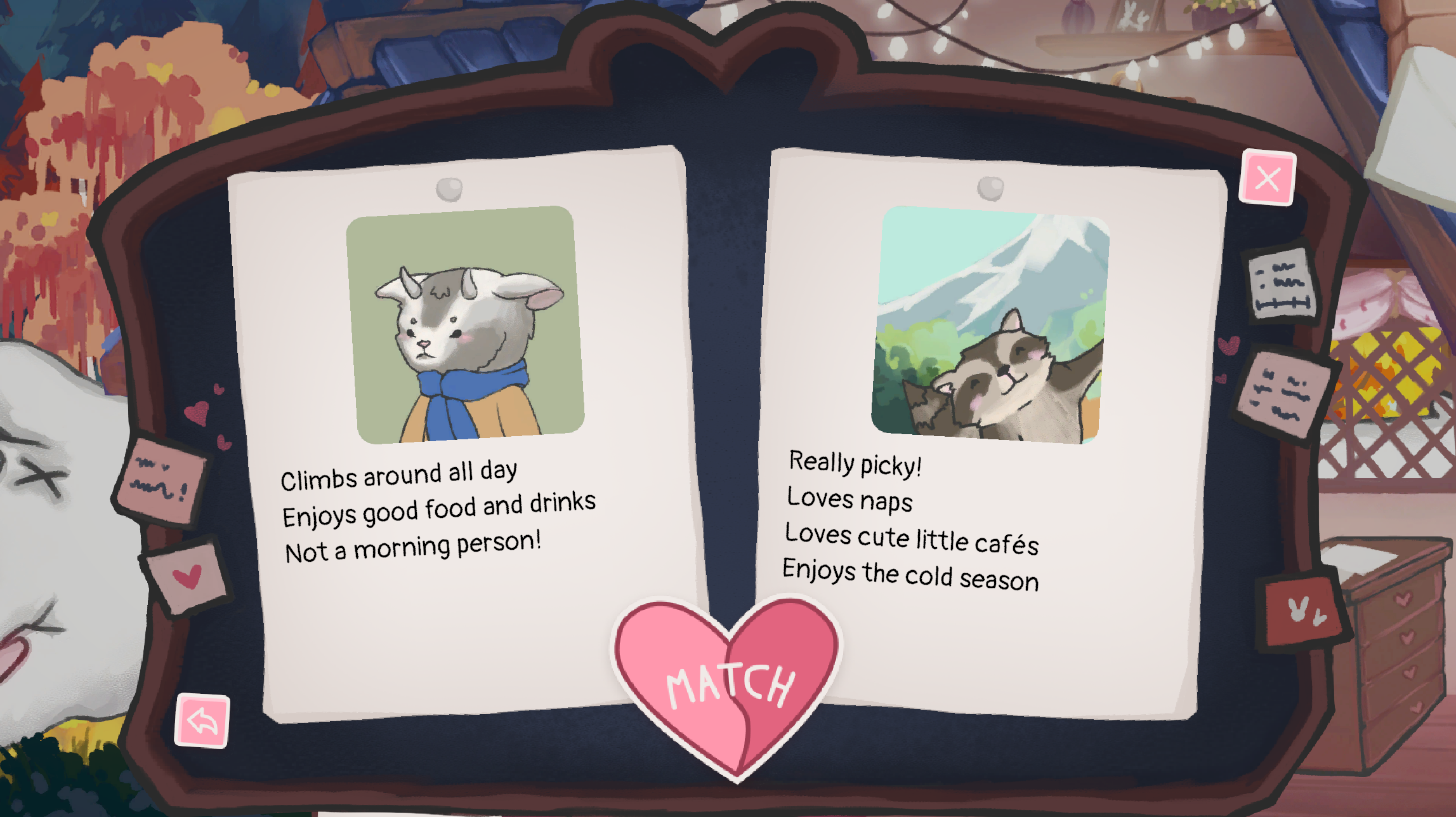 Based on a simple questionnaire you receive in person or via letter, you will have to match cute animals based on their interests.